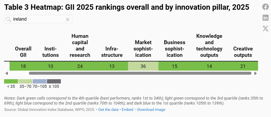 Figure sourced GII 2025 Results: Table 3 Heatmap: GII 2025 rankings overall and by innovation pillar, 2025, https://www.wipo.int/web-publications/global-innovation-index-2025/en/gii-2025-results.html