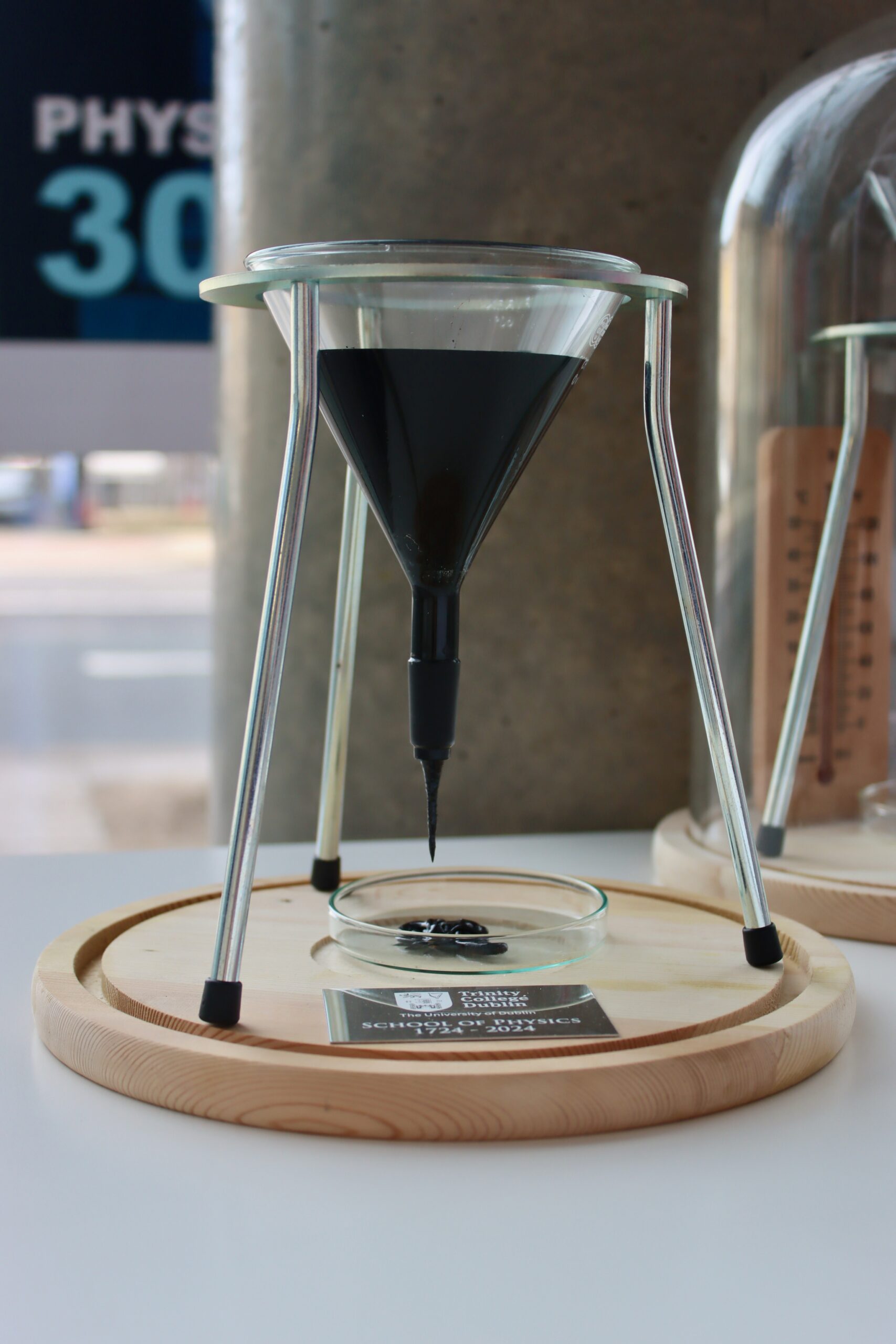 Hosted by Louise Bradley, physicist and Professor in TCD, the launch took place on Wednesday 27th November 2024. Stefan Hutzler who in 2013 alongside Shane Bergin captured a drop falling in Trinity College Dublin, becoming the first to record this rare moment. The time-lapse video attracted global media attention at the time with Discover Magazine naming the Trinity Pitch Drop in their top 100 science stories of 2013 and a feature article in Nature News the 3rd most-read piece on their website in 2013. In recognition of its global fame the pitch tar demonstration had been on display in the Eavan Boland Library since 2014 but returned to its permanent home in the School of Physics in time for the tercentenary.