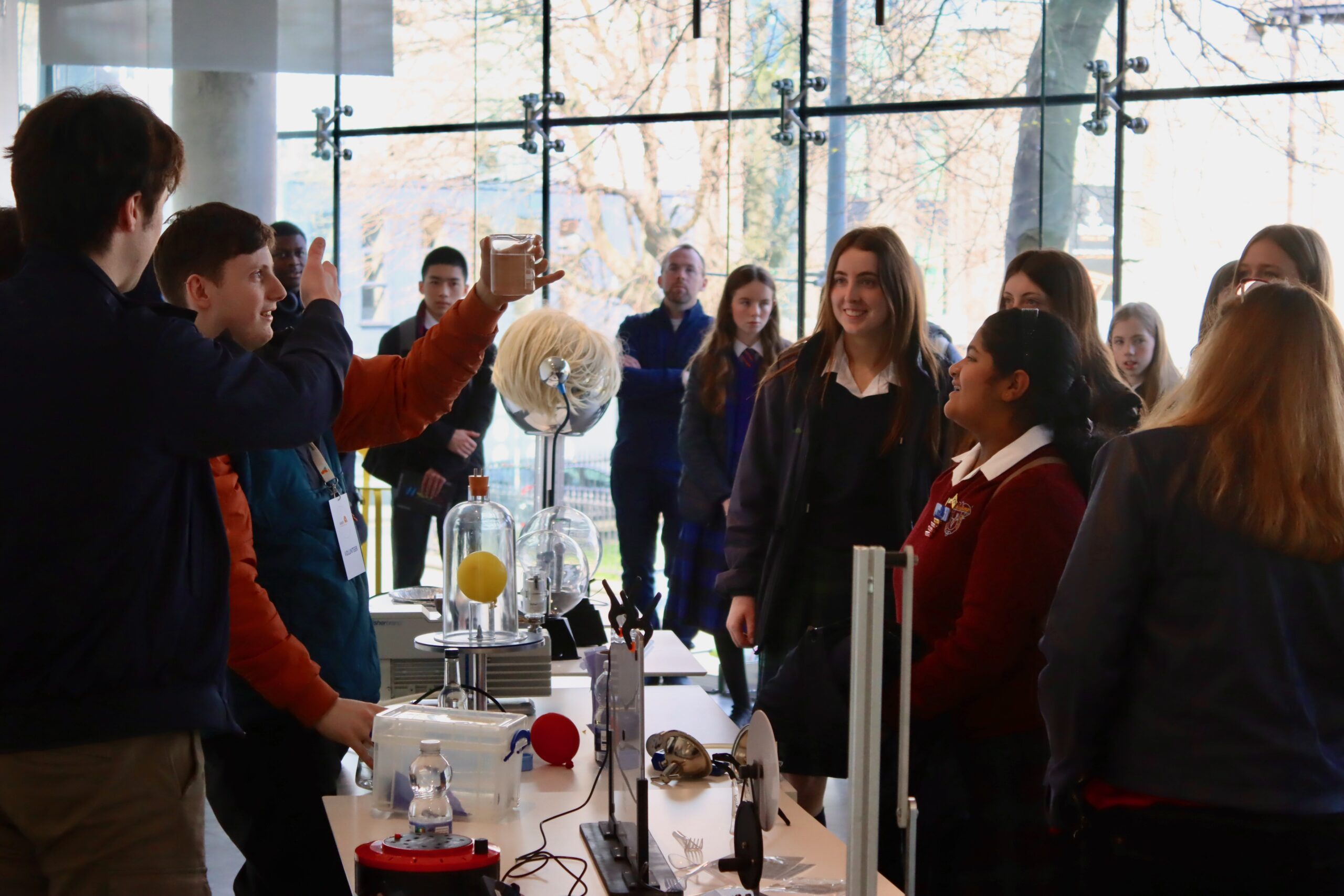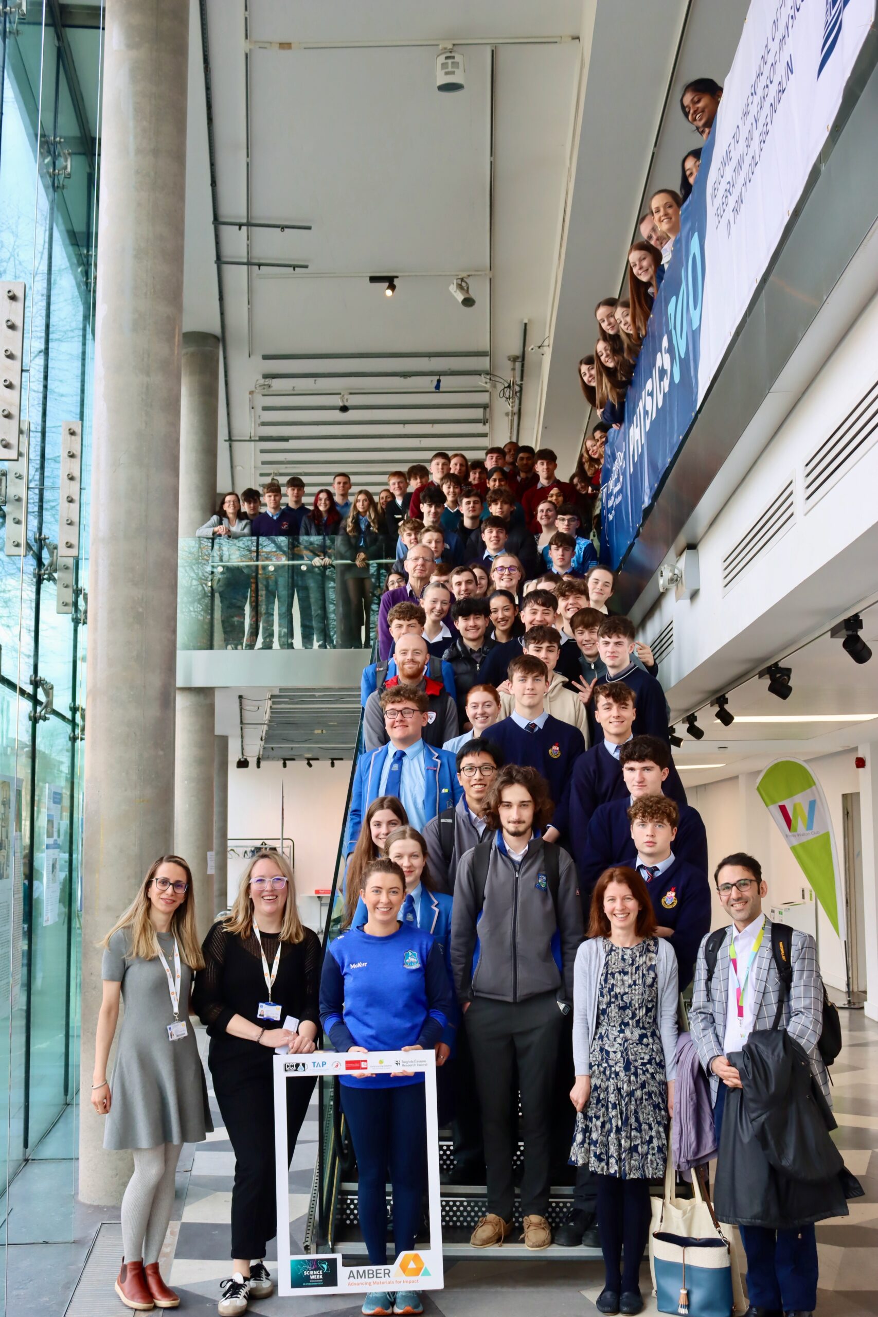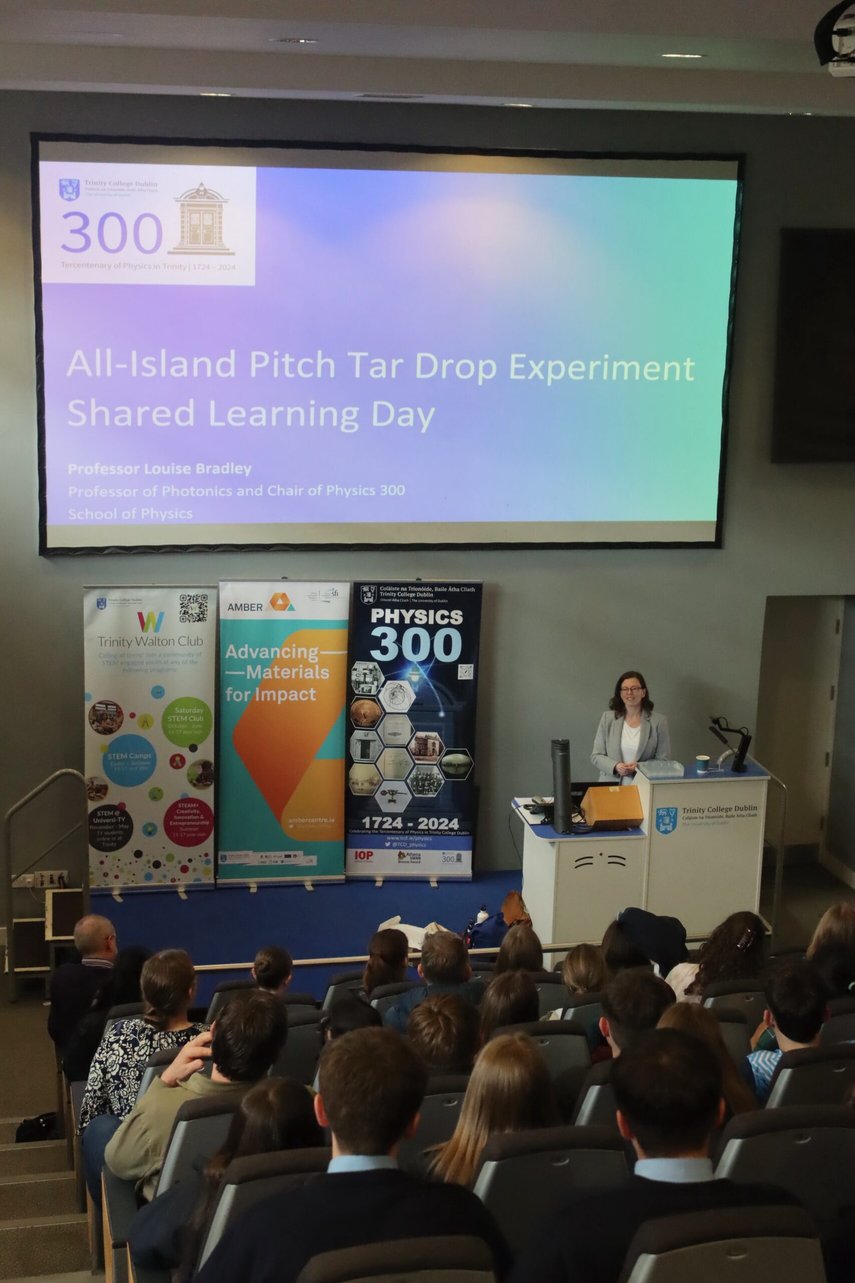 A National Pitch Tar Drop shared learning day took place in AMBER, Trinity College Dublin on 27th March 2025 hosted by the School of Physics, Trinity College Dublin and AMBER. Over 100 secondary school students who participated in the All Island Pitch Tar Drop Experiment attended the event showcasing scientific posters demonstrating the observations and outcomes of their own pitch tar experiments in the schools. The day included talks from: Professor Louise Bradley, Chair of Physics 300 and scientific experiment displays and interactions. Coordinated by AMBER’s Education and Public Engagement Manager Mairead Holden.
